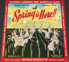 This page features a list of large size vegetable labels. Asparagus labels have an unusual shape. Because asparagus spears are fatter at the bottom than the top, the actual wooden crates were built slightly wider at the bottom. Therefore, nearly all asparagus labels are wider at the bottom, too. The labels on this page date between the early 1930s and 1970s. The dimensions of asparagus labels are roughly 10" tall, 10.5" wide on the bottom, 9" wide across the top